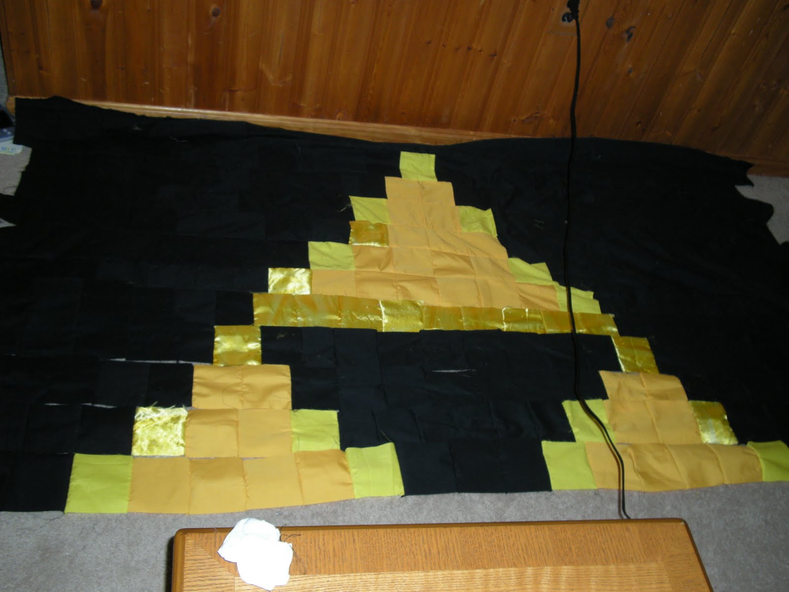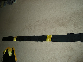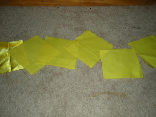 I started out with a bagillion of these. 4 and 1/2" squares (give or take, i REALLY hate measuring.. some of them are kind of rectangles.) My grandma told me this would be the easiest type of quilt to make, so.. here we go. it took me FOREVER to cut out the pieces.. i cut up 5 yards of black and around 3 yards of yellow.. just FYI, the finished quilt dimensions should be around 7 and 1/2 feet around.. yeah. its going to be giant. before i redid the pattern, it was around ELEVEN FEET. so needless to say, i am really glad that i decided to shrink the pattern up. :]