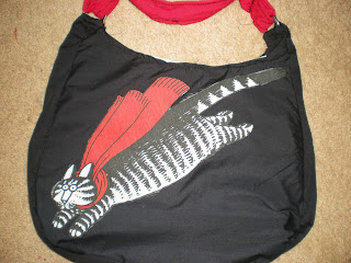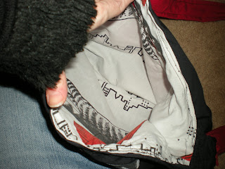and here is the awkward "this is the liner" shot. it doesn't do it much justice, but its the kitty fabric on the inside. <3 i love it. and it has a zippered pocket. i always have trouble sewing the liner into the bag, i wish there was an easy way to do it.. im sure i'm just missing it somehow... :/ *sigh*