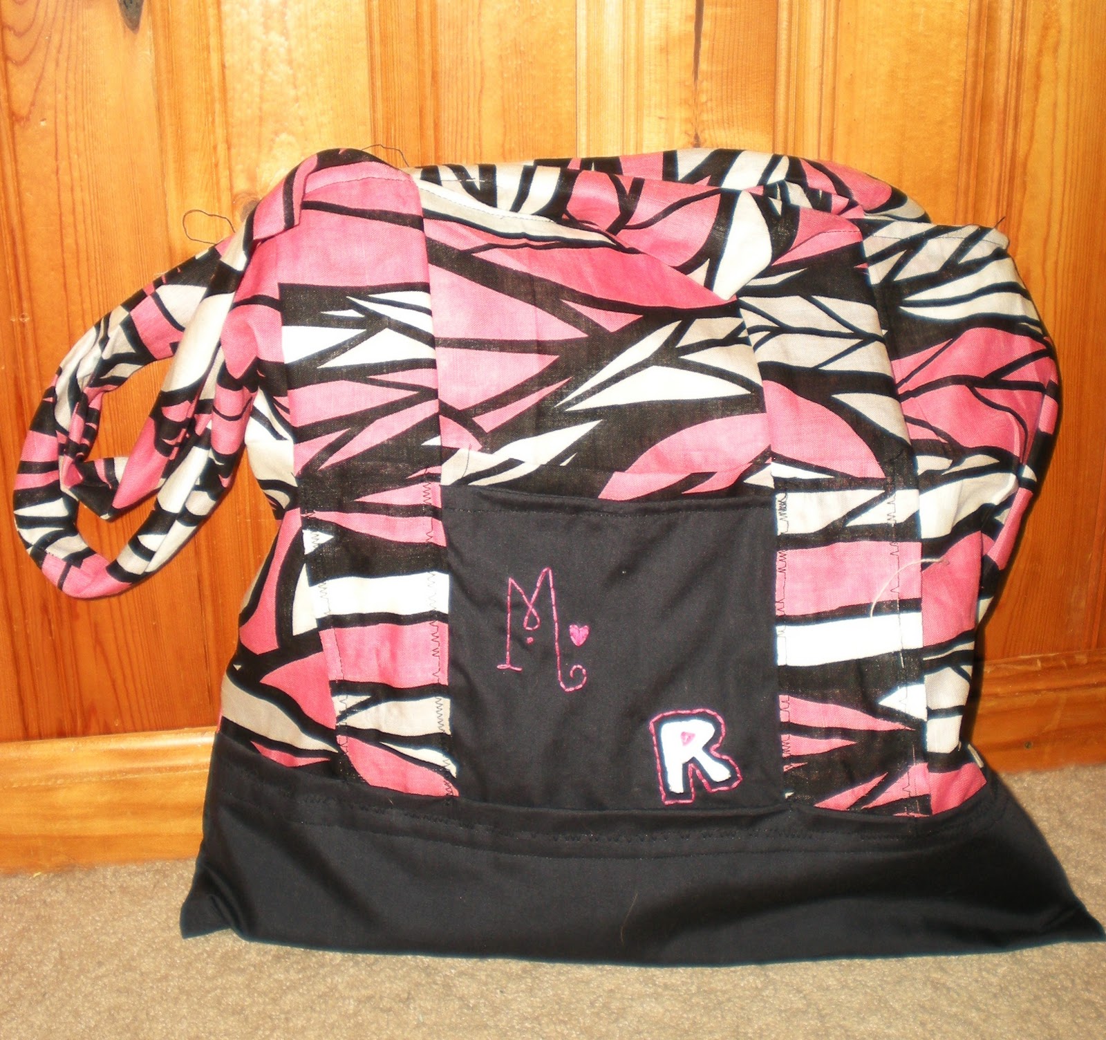 here is the shot together, the flash really drowned out the beauty of this fabric.. it was a remnant at Joannes.. its actually linen.. (I have never sewn linen before.. and probably never will again. it kept getting caught in the machine and snagging. it was seriously a pain. lol) the pattern i loved.. but i had no idea what to do with it. i played around with maybe a skirt.. maybe curtains? i had no idea.. so it sat in my fabric box until yesterday. as soon as i saw the fabric I *knew* i had to make it for her. I altered a pattern I had already made for my carry on airplane bag.. and made it much smaller.