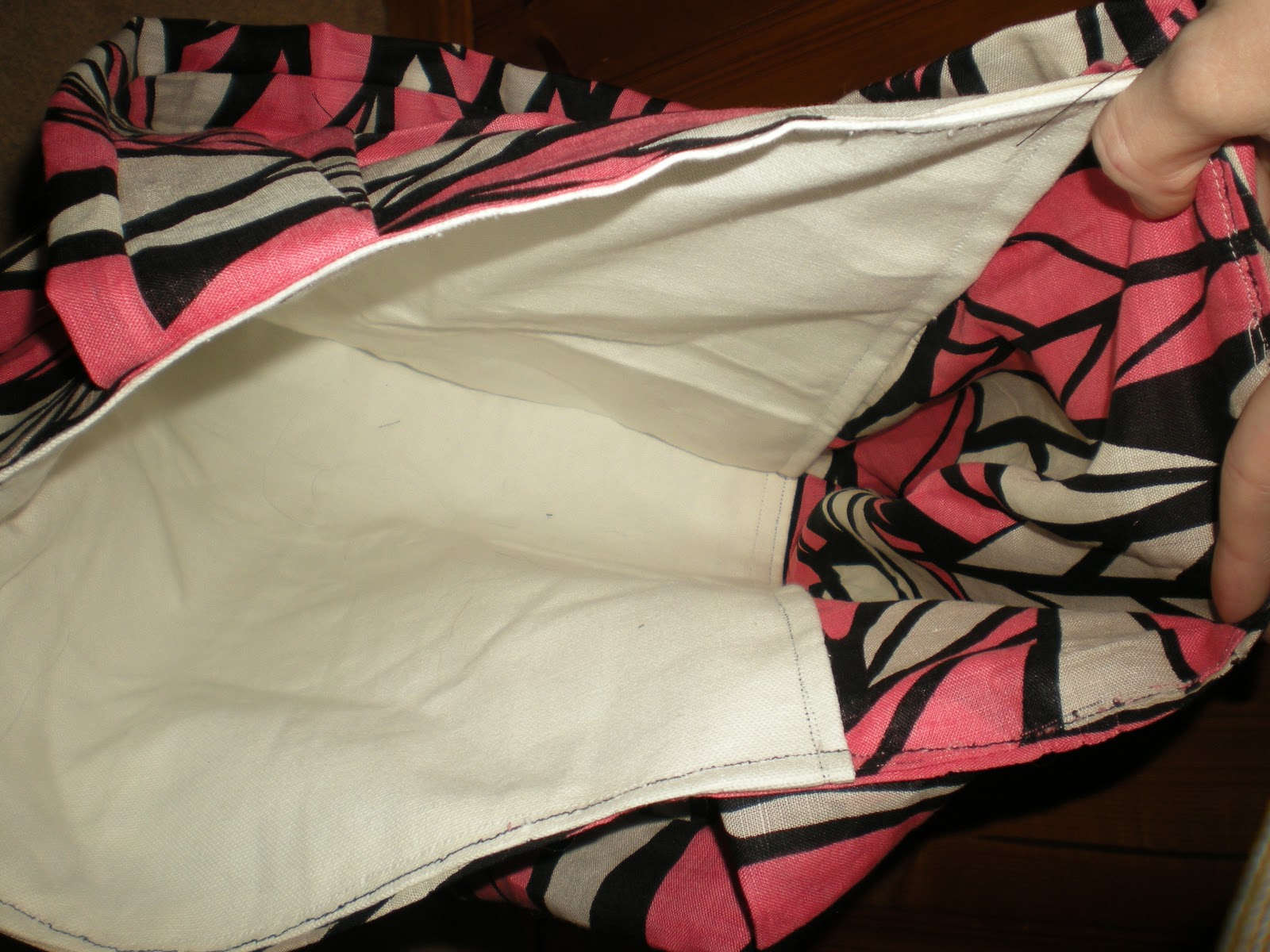 Here's a shot of the bag itself.. i put her initials on the bag.. the "M" is embroidered on (yeah, thats my handwriting lol) and the "R" is a reverse applique.. which is another thing i have never done.. and it was actually pretty fun. seriously. im looking at the picture now.. and it didn't do my beautiful fabric justice. the straps are also made of the same fabric.. they're soft. :] On a side-note, I used a much firmer fabric on the interior.. like a stiff white fabric (the exterior is semi-sheer, so the white underneath really allowed the white parts of the linen to be bright.) UNFORTUNATELY, the white is the same fabric i obsessively make reusable bags out of.. so i didn't have enough.. luckily, i'm pretty creative.. so i added a piece of the linen to the inside of the bag. here, enjoy this awkward picture.