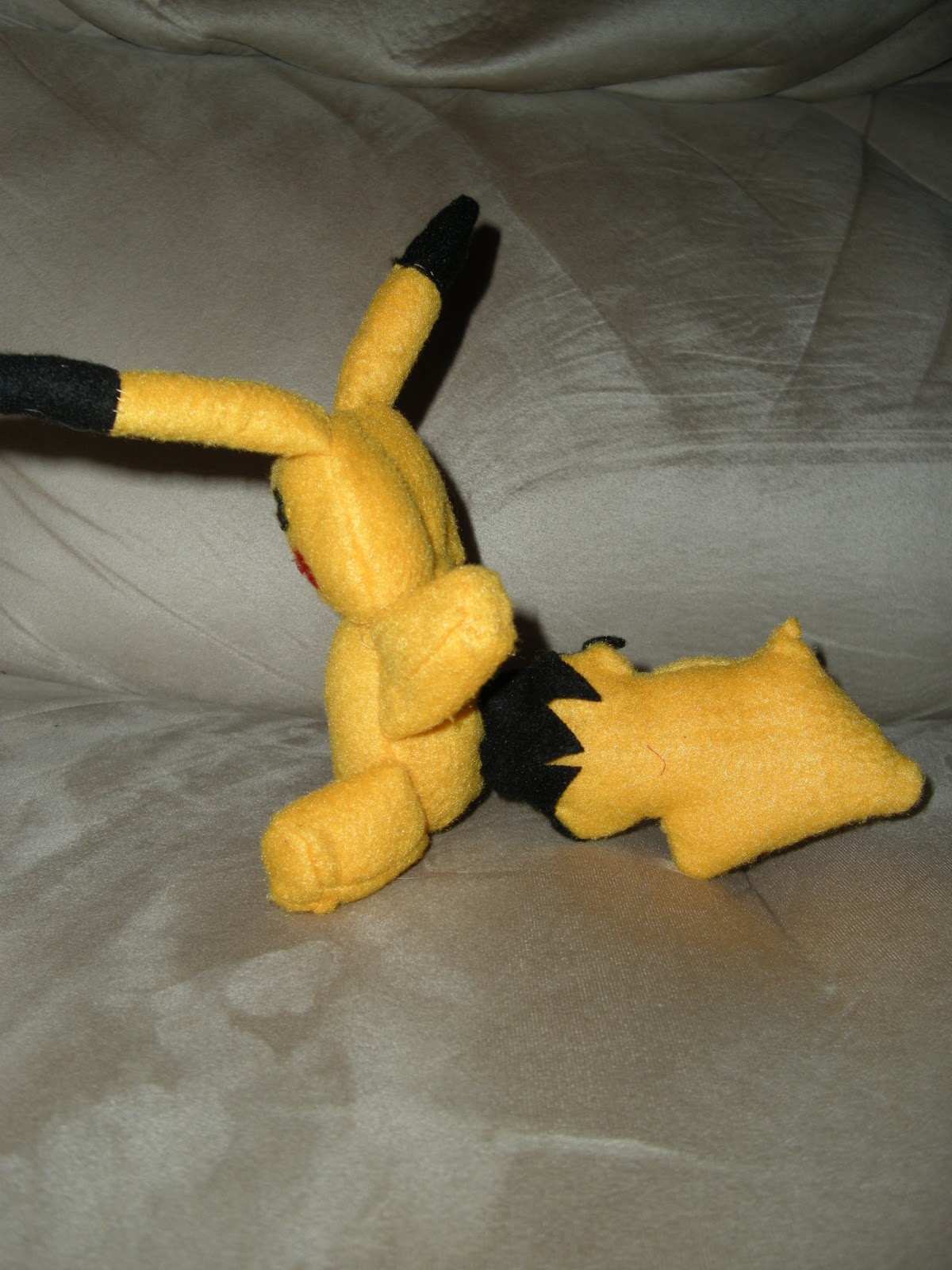 thats my little dude!! :]]]]]]] his cheeks i just drew on with marker.. he's just a practice, so i can get the feel of a pikachu.. :]] i know the back of his tail is supposed to be brown, but i didn't have a lot of brown fabric.. i need to save it for my costume... so in retrospect, i suppose i should've made a pichu instead... :/