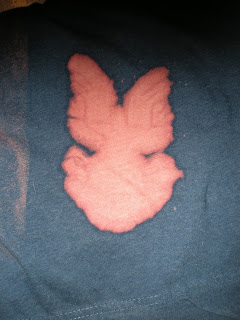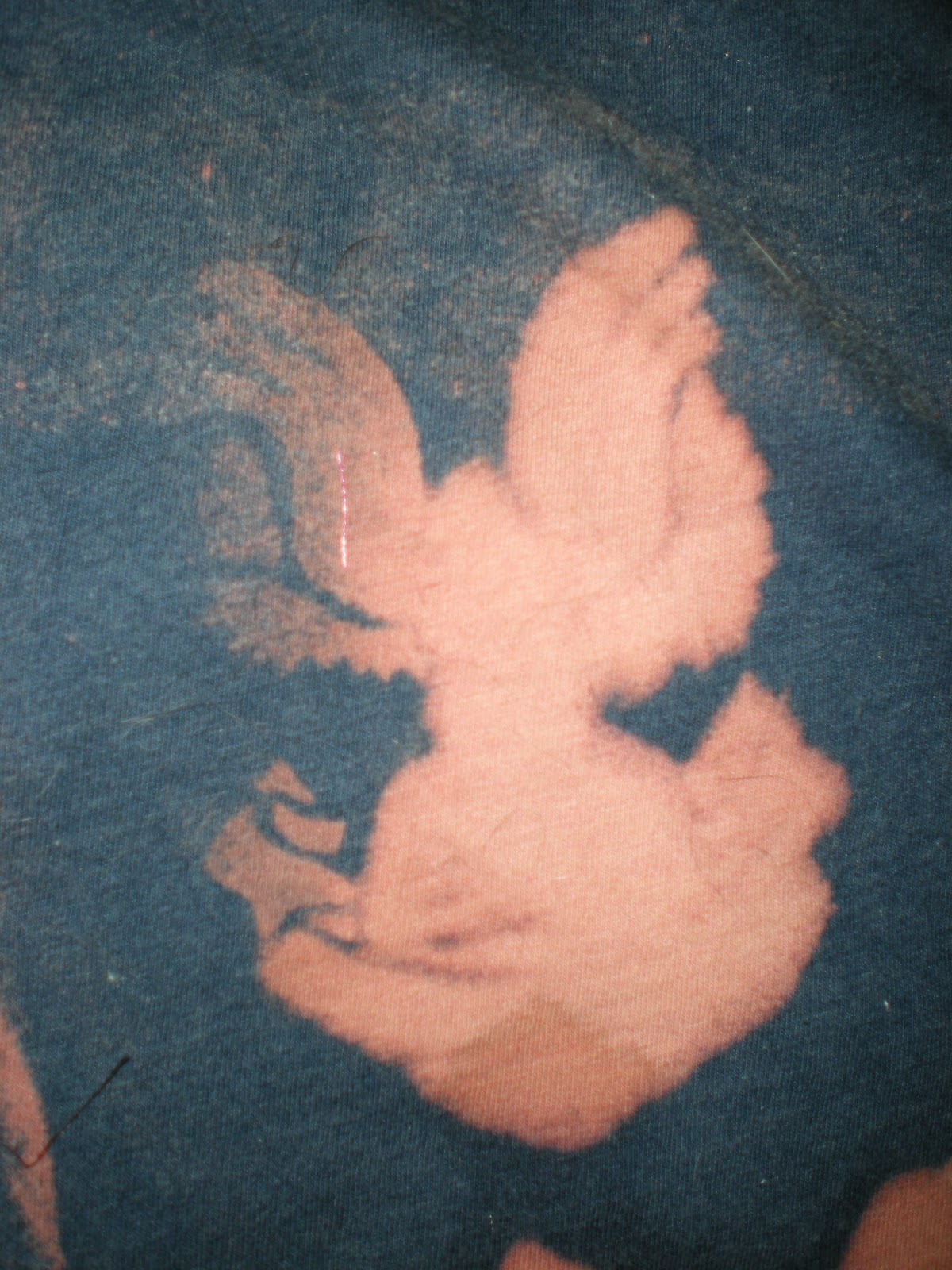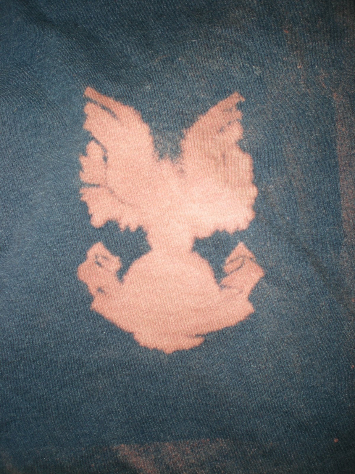 This was my go at using freezer paper & bleach. the waxiness did prevent a bunch of bleeding, but I was still left with a weird halo around the whole thing. I ended up deciding that this stencil was too complex for bleach.