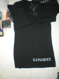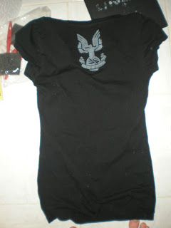 Front view with logo at the bottom. I like to keep things subtle on the front.. i hate having glaring things on my chest, not to mention this shirt is a v-neck, so anything on the front top would look stupid.. I wanted so badly to have "UNSC" on the shirt, so i finally decided to put it on the bottom. <3